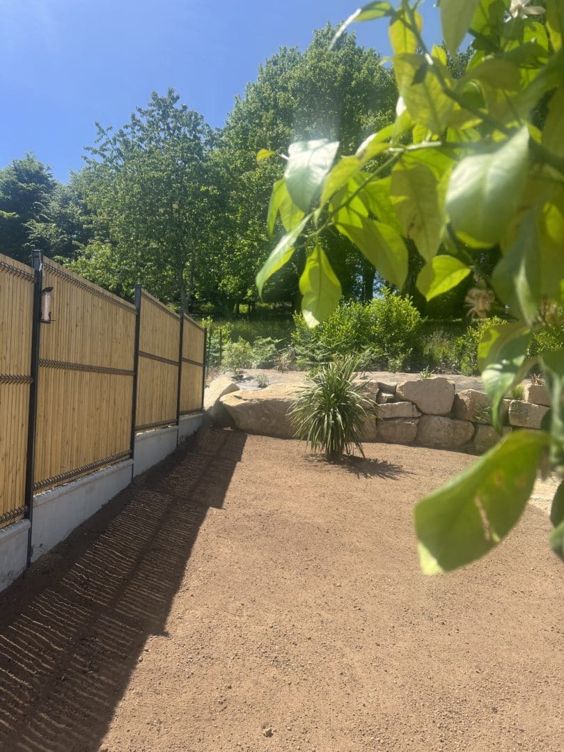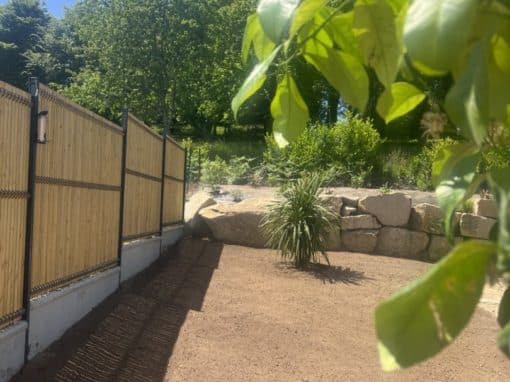 Pose d’une clôture avec plaques de soubassement et lames d’occultation en bois, terrassement et engazonnement (avant / après).